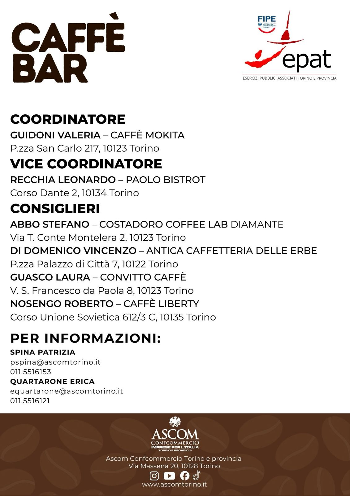 In Epat il gruppo Caffè Bar è molto attivo, promuovendo molte iniziative e affrontando le maggiori tematiche che riguardano il settore di Pubblici Esercizi della città: dal nuovo regolamento sui dehors, alle linee guida della nuova ZTL, dalla formazione ai nuovi strumenti innovativi al servizio della categoria come il marchio BEST BAR, importante rinoscimento di qualità.
