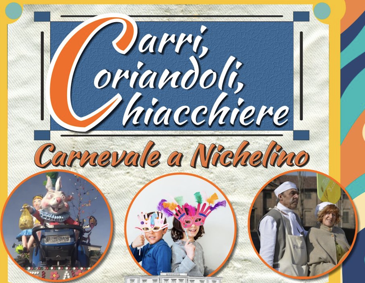 Con Madama Farina e Monsú Panaté, animazione musicale, cosplayers, giochi e balli di gruppo, concorso e premiazioni delle maschere a cura di Pro Loco Nichelino, distribuzione di tè caldo e chiacchiere a cura di AVIS Nichelino, bancarelle.
