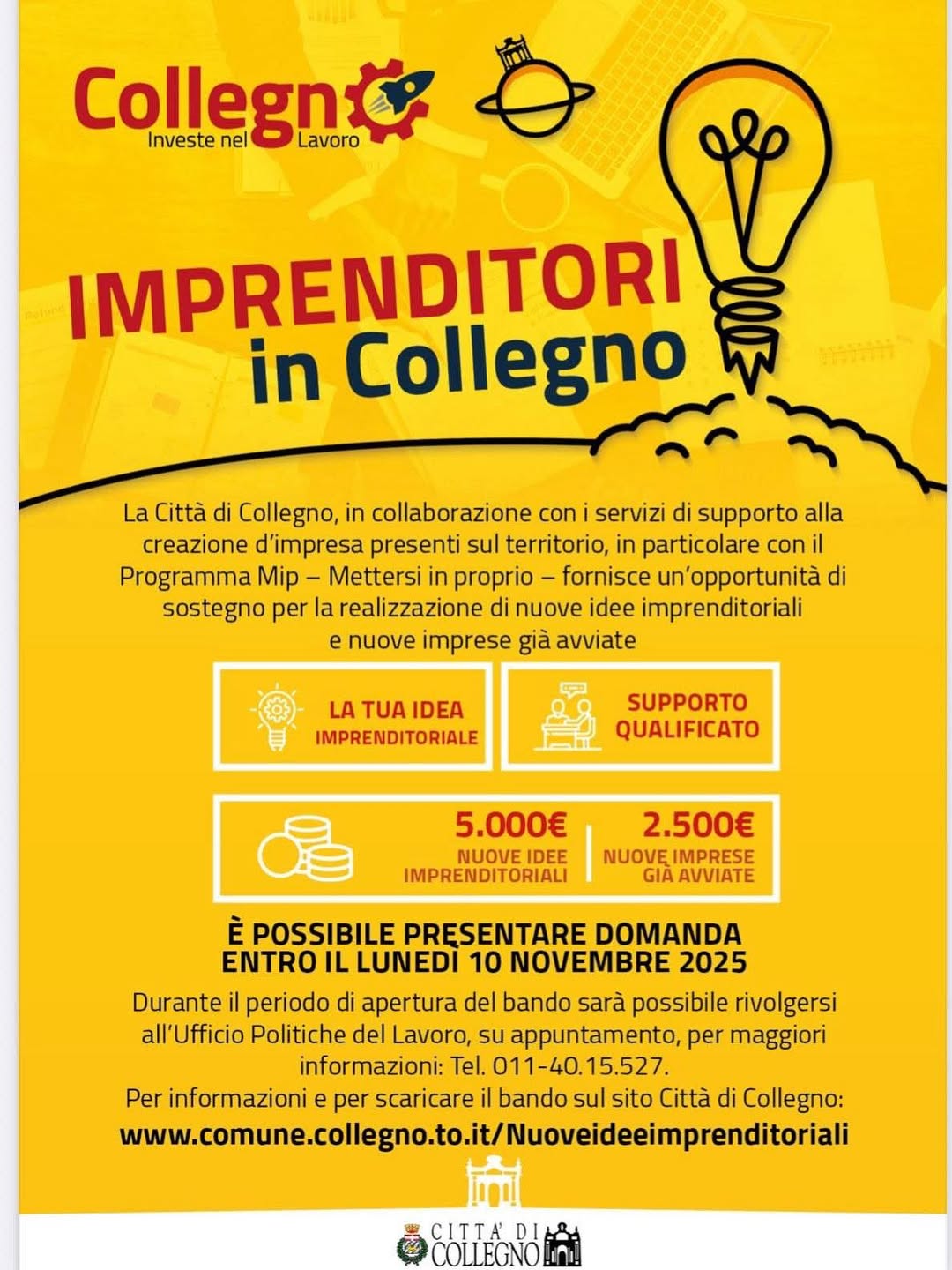Riparte con alcune novità la nuova edizione del bando “Imprenditori in Collegno 2025”, l’iniziativa promossa dal Comune di Collegno per accompagnare e sostenere chi desidera trasformare un’idea in impresa.
