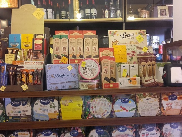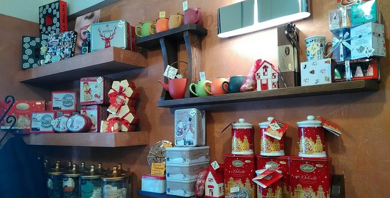 Bar torrefazione Caffè Vergnano, vendiamo cioccolatini Venchi, Caffarel, Lindt e caramelle Leone, sia sfusi sia in scatola; panettoni artigianali, colombe pasquali; vini Marchesi di Barolo; oggettistica e tè sfusi di La Via del Tè.
