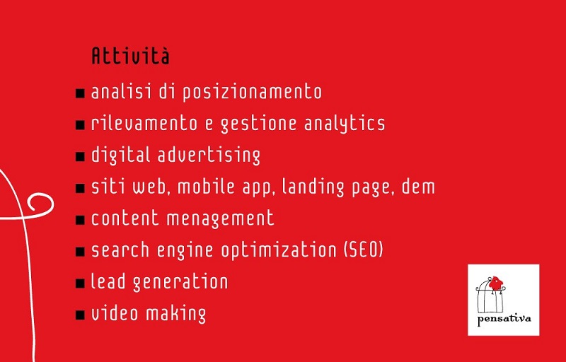 Pensativa è un’agenzia di marketing digitale che offre ai propri clienti tutti i servizi necessari per comunicare, promuoversi o vendere online. Offriamo la nostra consulenza a partire dall’analisi di posizionamento: conoscere il mercato e sapersi orientare è il primo requisito. Ma è anche fondamentale il rilevamento e l’analisi delle metriche: ogni azione che si intraprende, dalla creazione di una piattaforma a una campagna seo o advertising, dev’essere sempre accompagnata da un attento esame degli analytics disponibili. Progettiamo campagne di digital advertising selezionando fra gli strumenti disponibili (Google ADS, Facebook ADS, ecc.) quelli in grado di ridurre gli sprechi e massimizzare i ritorni commerciali. Realizziamo siti web e mobile app con particolare cura dei contenuti e del SEO, facendo keyword density e inserendo i dati strutturati per il web semantico. Ci occupiamo inoltre delle landing page, delle dem e dell’attività di lead generation.