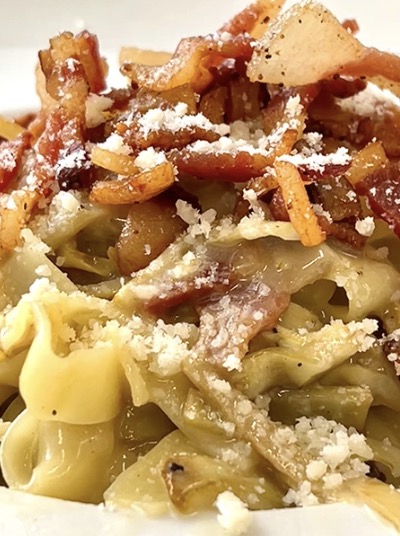 Allo Chef piace mescolare piemontesità e romanità, ne sono un esempio la Tartufonara, una Carbonara rivisitata utilizzando il parmigiano invecchiato diciotto mesi e il tartufo nero, e la tartare di fassone su un letto di puntarelle con guanciale fritto e scaglie di pecorino.