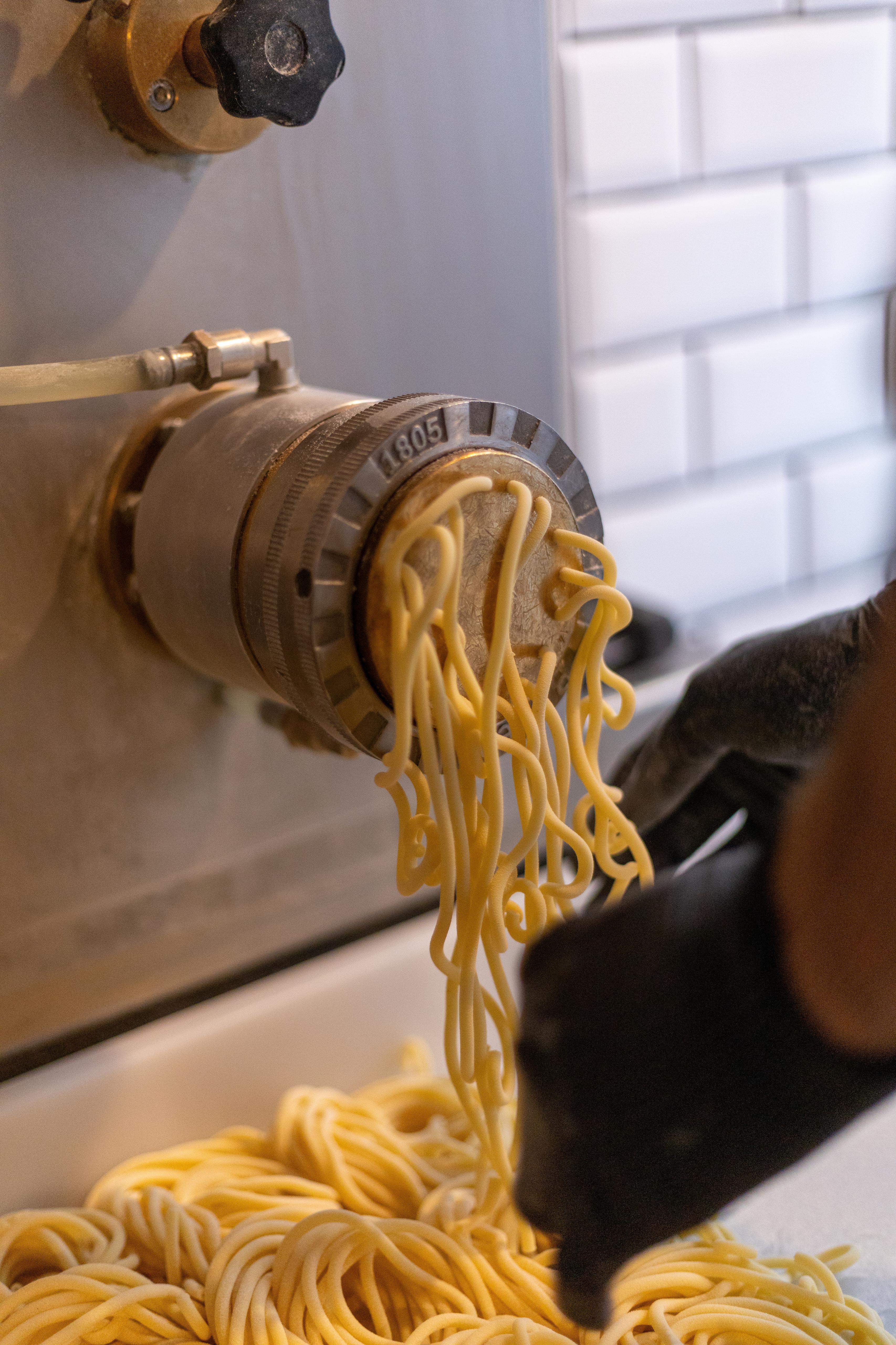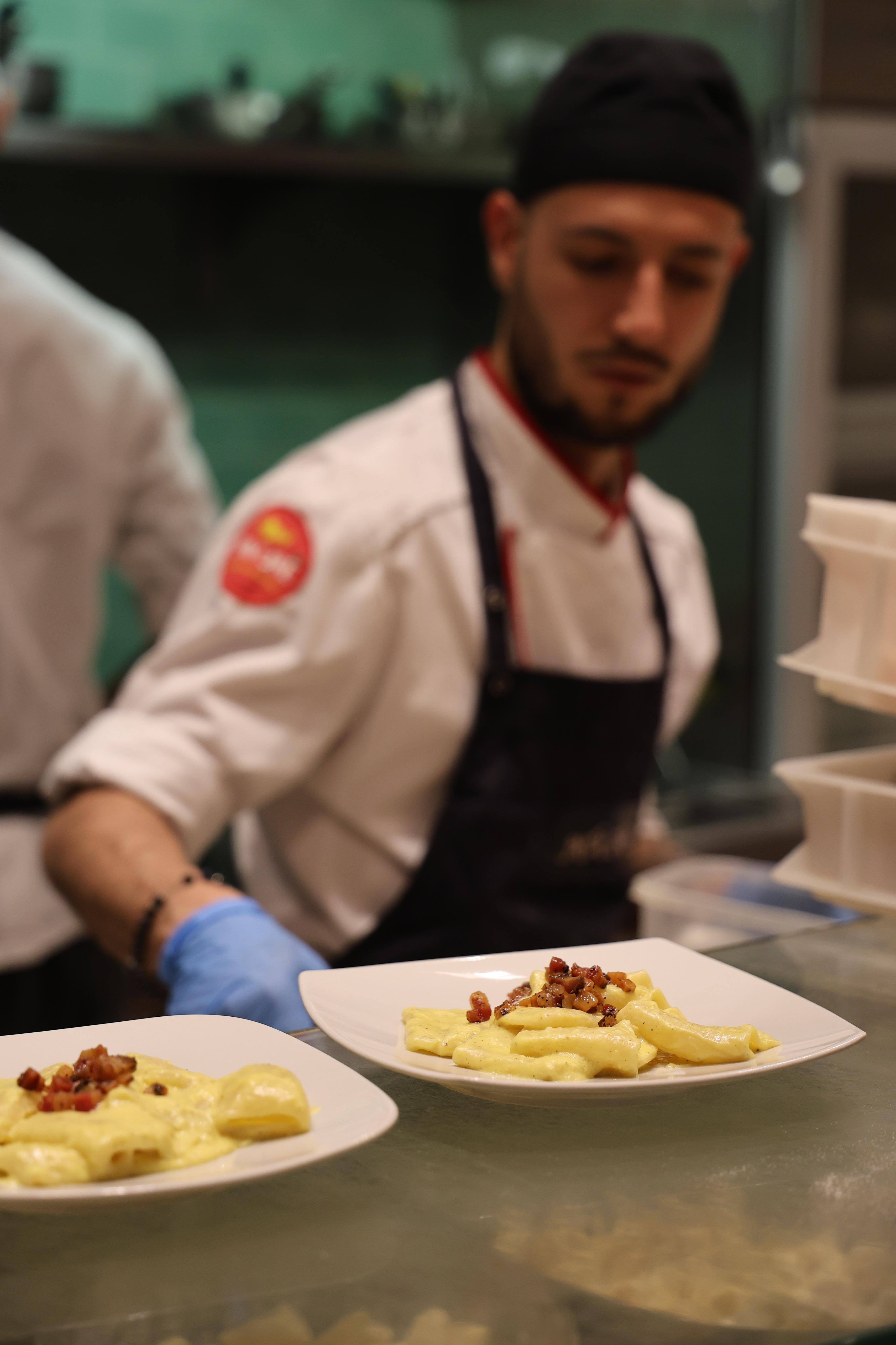 Appena si entra, non è solo il gusto a essere coinvolto: un intenso profumo di farina accoglie i clienti, anticipando l’esperienza culinaria. Al mattino, è possibile osservare la preparazione della pasta fresca nel laboratorio a vista di Via Madama Cristina, dove i pastai preparano con cura e amore diversi formati secondo la tradizione artigianale. Qui, la pasta non è solo il piatto principale, ma diventa un elemento che unisce, che riporta alla convivialità, al piacere di stare insieme a tavola.