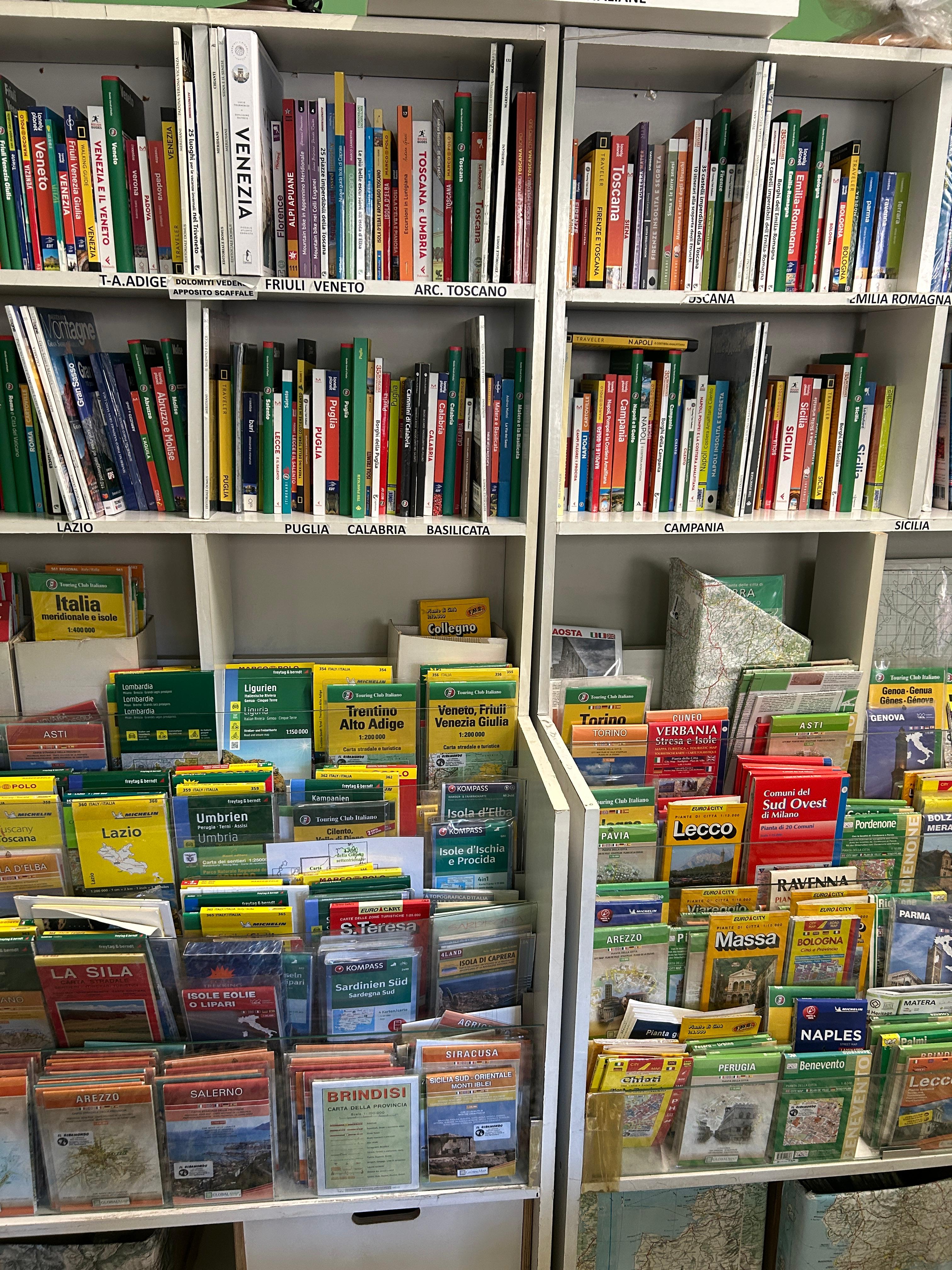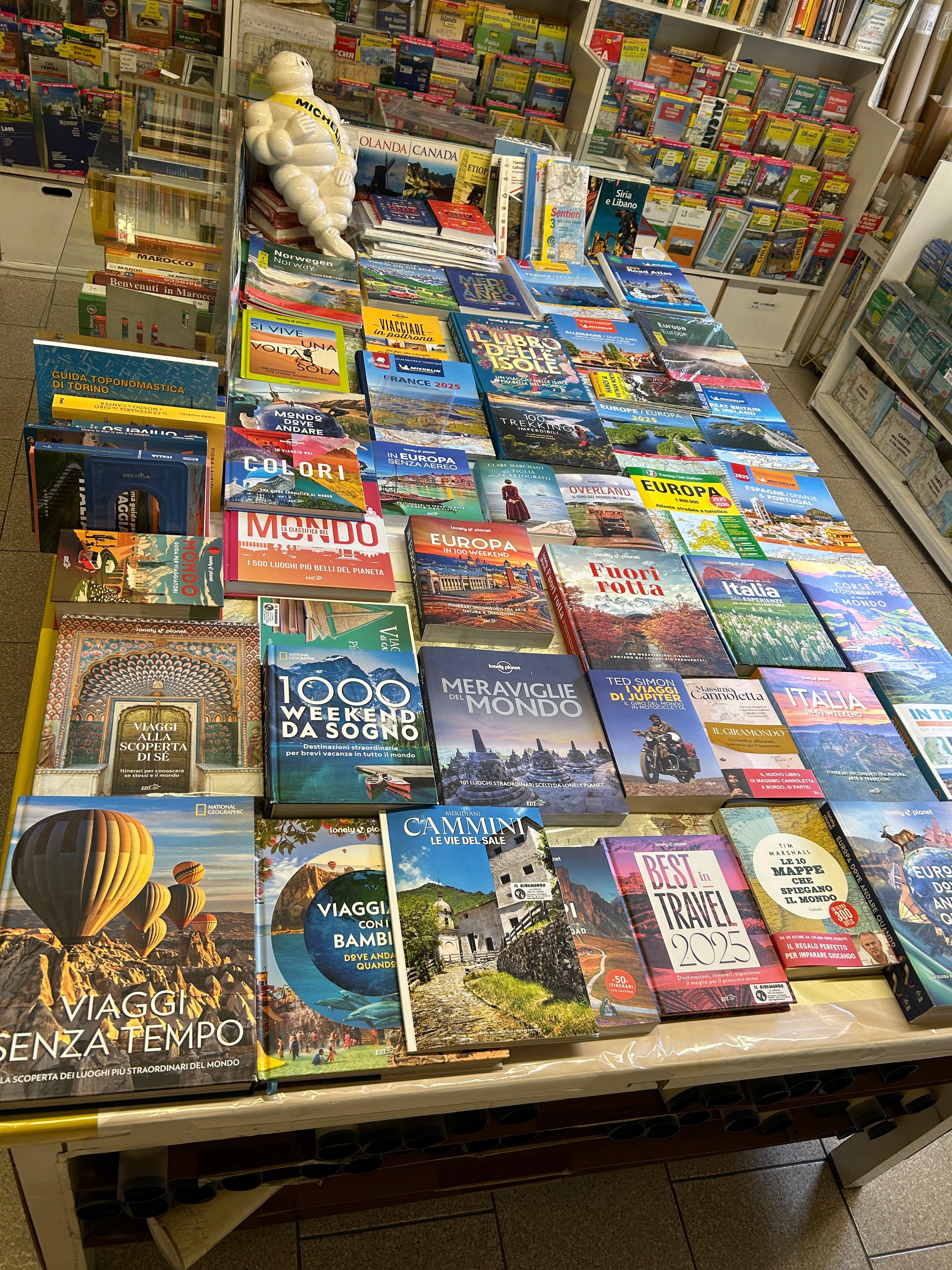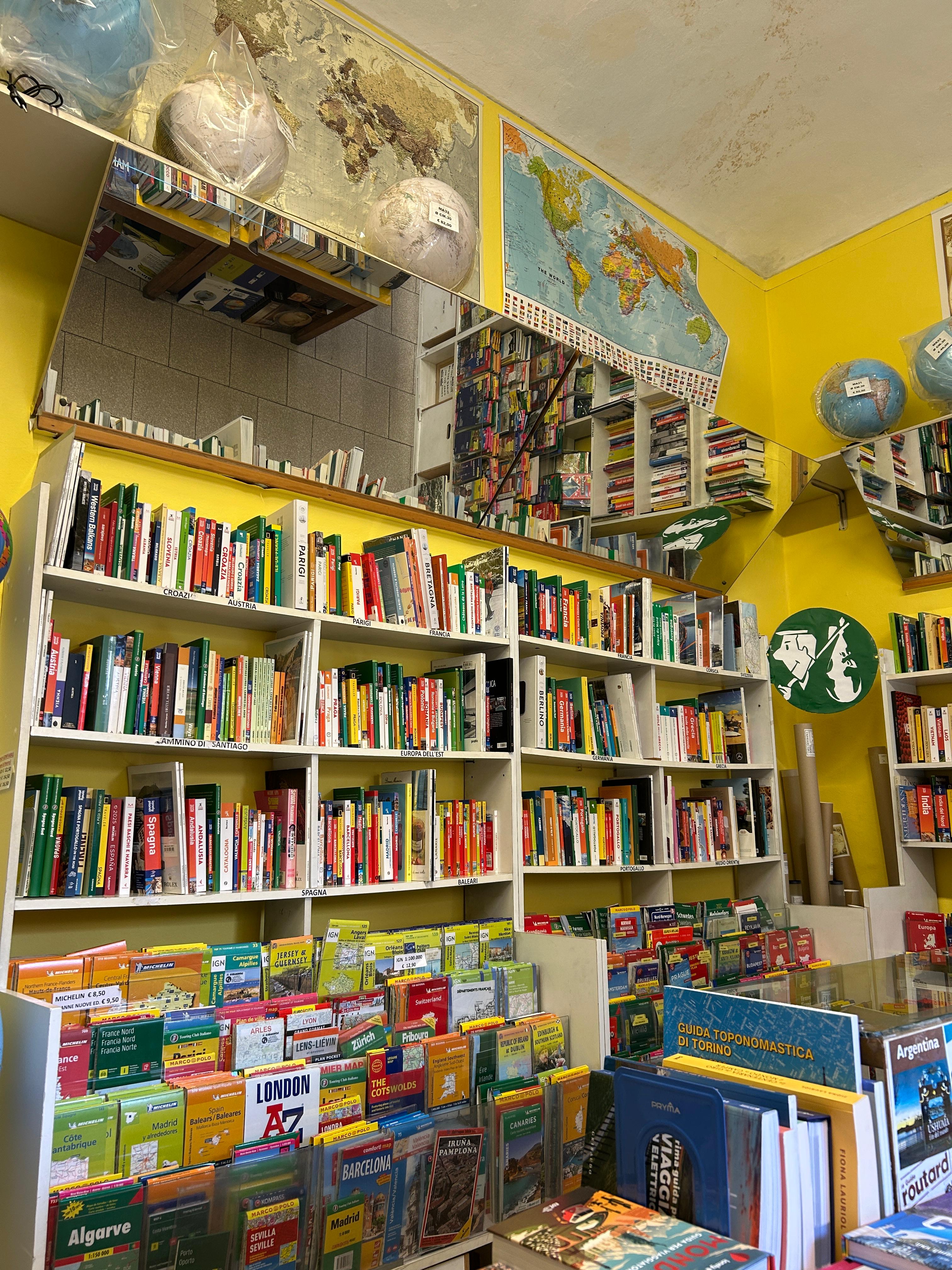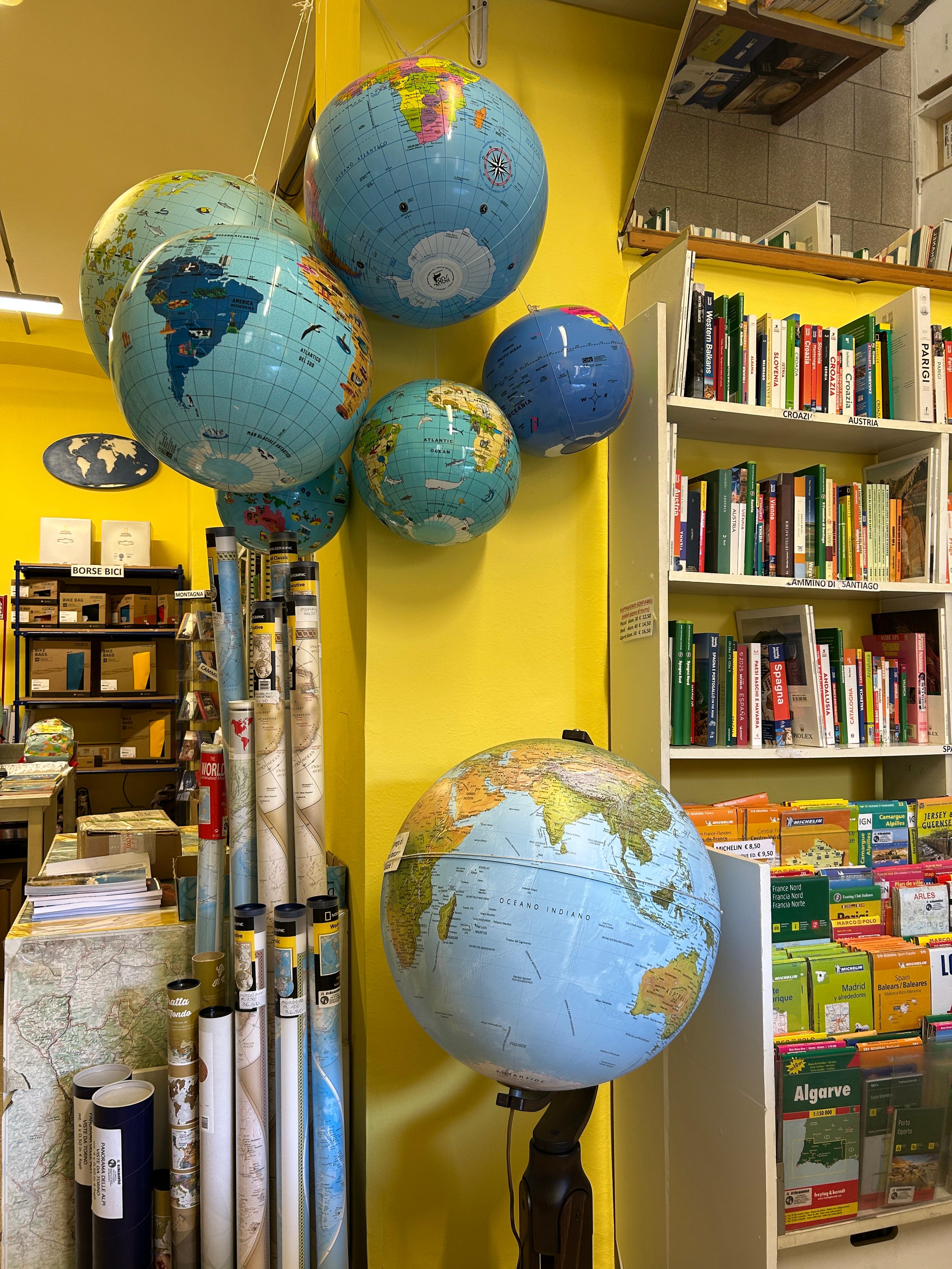 Accanto alle guide turistiche, le carte geografiche diventano il cuore pulsante del negozio: ordinate con cura, spaziano dalle mappe tradizionali a quelle in rilievo, dalle più comuni a quelle quasi introvabili. Ci sono carte per le escursioni sulle montagne italiane, atlanti stradali di Paesi lontani, fino a mappamondi di ogni dimensione che invitano a viaggiare con lo sguardo. Luogo per sognatori e impenitenti viaggiatori, o per chi soltanto desidera una straordinaria idea regalo, entrare nella libreria Il Giramondo significa avere il mondo intero a portata di mano, pronto per essere esplorato.
